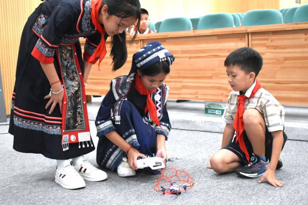 谁说学习不能像游戏一样好玩?在公益课堂上,队员们玩嗨了!他们亲手操控无人机,在操场上划出一道道炫酷的飞行轨迹,感受科技联通未来的力量。“当无人机从我手中升起时,我真正感受到了科技跨越地域的魅力,”防城港市滩散小学的一名队员兴奋地说道。玩完高科技,再来点“传统味”!大家围坐一圈,学习壮族传统染画技艺,在共同创作染画中描绘民族团结的美好图景。抛绣球、国旗操、整理营地……大家在合作中学会了分享,在挑战中变得更勇敢。